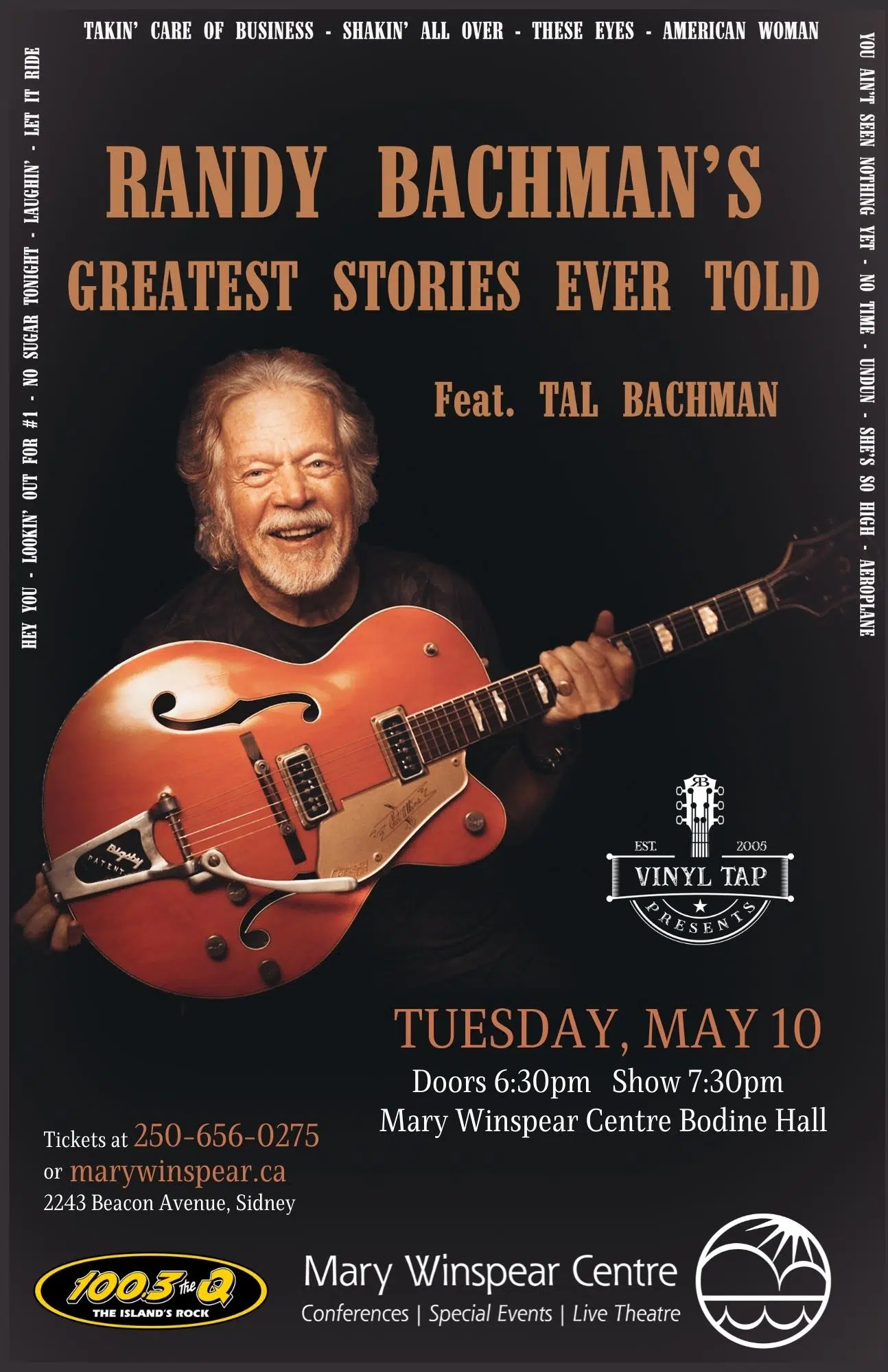 A One Night Only kind of evening of music and untold stories. Songbook selections deep from the catalog of Randy and Tal Bachman while performing live with their band. Told in the style of Randy’s hit radio show Vinyl Tap, and along with historic vintage visuals. Hear stories from Tal as a child growing up with a rock star dad, the hit songs we grew up on including The Guess Who and Bachman-Turner Overdrive, plus tales of characters met along the way….and for the very first time hear brand new tunes from Randy and Tal’s upcoming father and son record, “Bachman & Bachman”