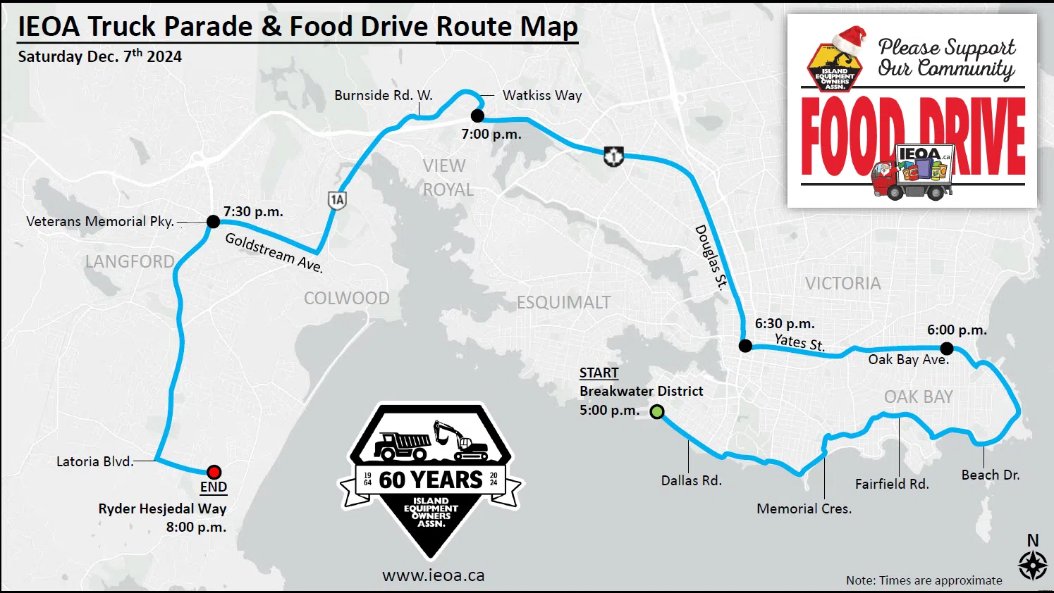 Dump trucks, equipment trailers, crane trucks, pump trucks, fire trucks, coast guard vessels, mixer trucks, military, transit, and more will weave through the streets and spread holiday cheer to encourage spectators to contribute to local food banks and brighten the holidays for those in need. Route maps, GPS, Food Bank links, and more details are available at IEOA.ca