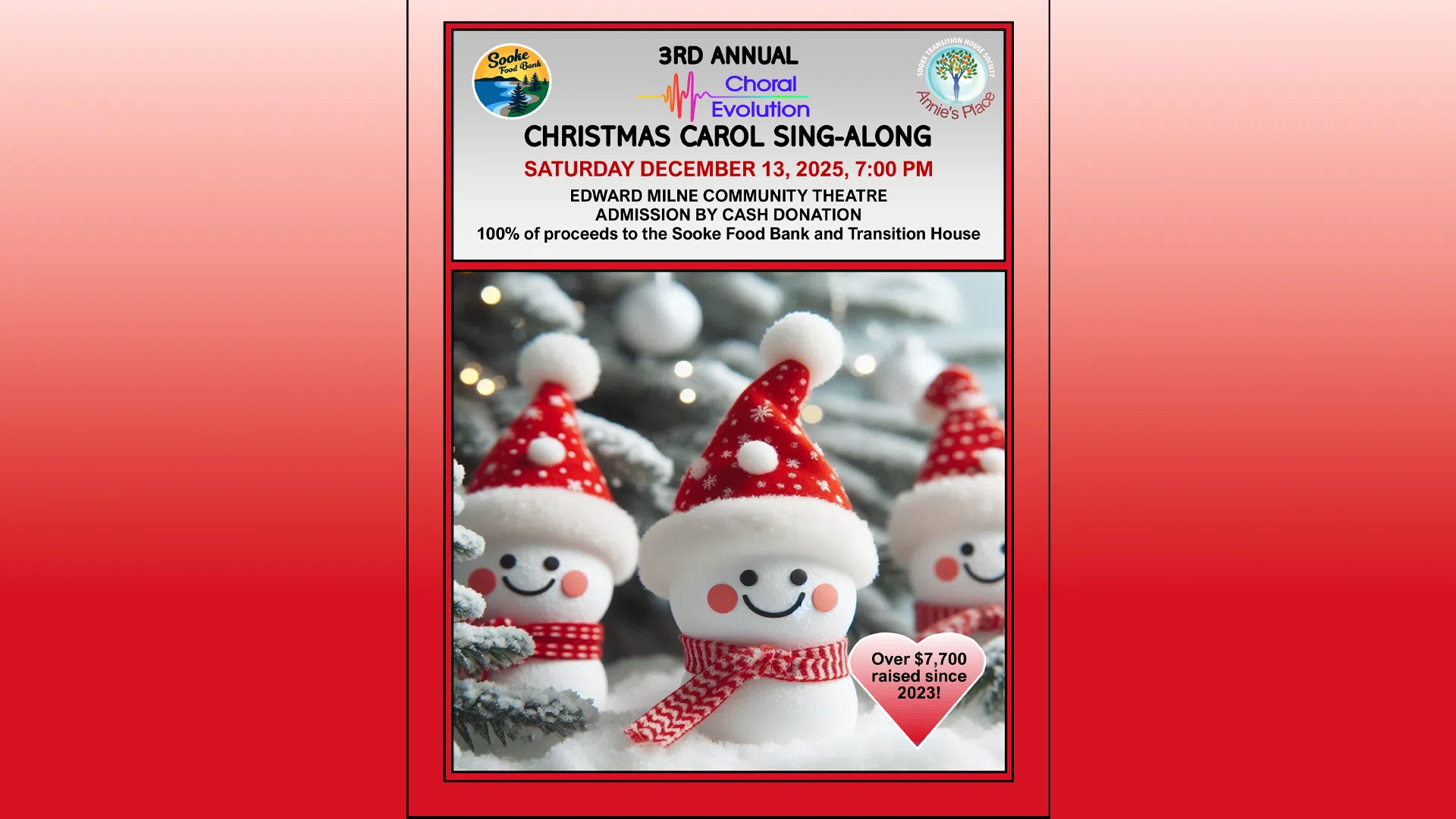 The Choral Evolution Sooke Christmas Sing-Along will be at 7PM on Saturday, December 13, 2025 at Edward Milne Community School, Sooke, BC. The concert will be in support of Sooke Food Bank and Annie's Place (Sooke Transition House), which provides food and other essentials to those in need in our community at this special time of year. Admission is by cash donation, and all donations go directly to Sooke Food Bank and Annie's Place.